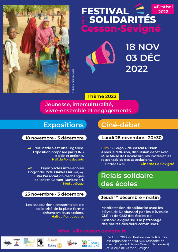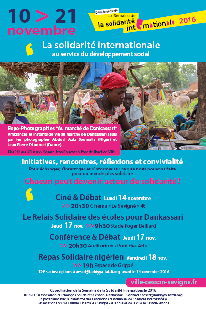 - du 13 au 21 novembre à l’Espace Citoyen à Cesson, exposition « Les actions des associations cessonnaises de Solidarité Internationale », avec plusieurs panneaux sur la coopération décentralisée Cesson Dankassari,