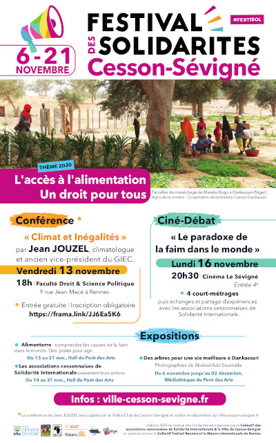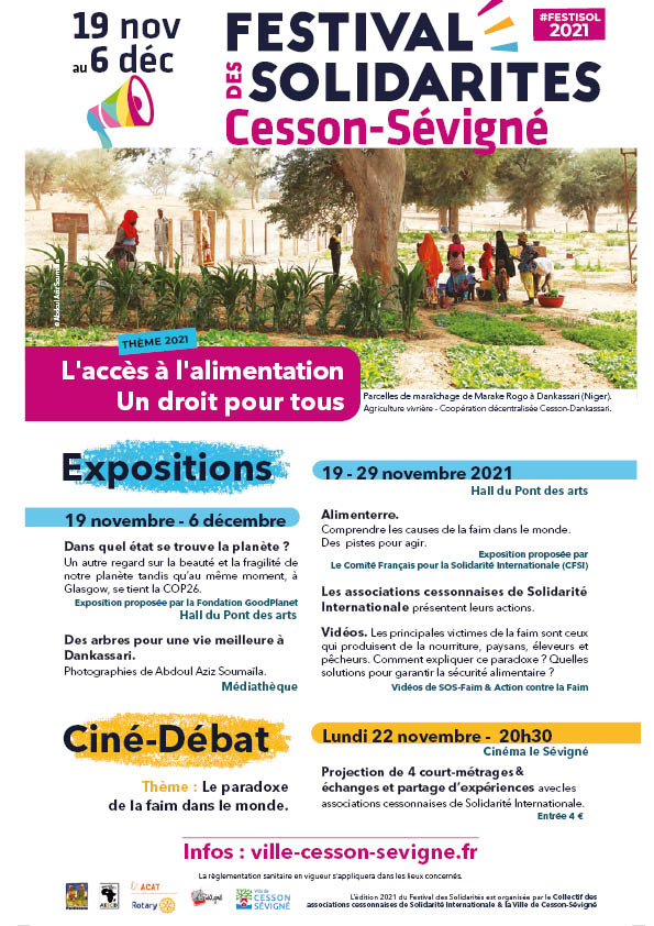 - du 13 au 21 novembre Exposition Alimenterre, Hall du Pont des Arts (Cesson-Sévigné), comprendre les causes de la faim le monde, des pistes pour agir et présentation des activités des associations cessonnaises de solidarité internationale.