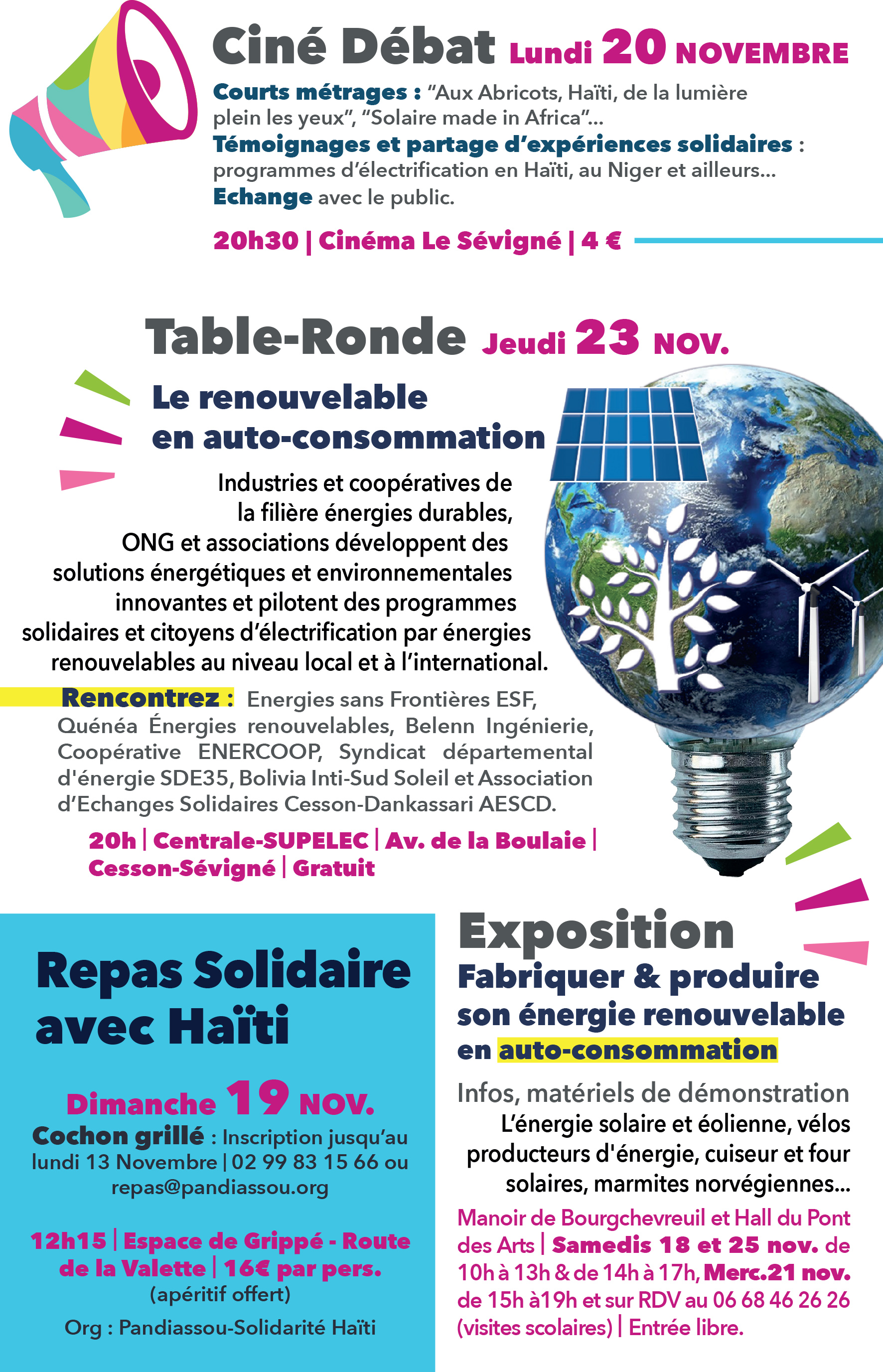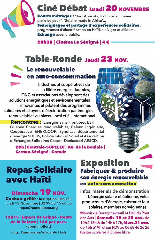 - le jeudi 23 novembre à 20 H 30 à l’auditorium de l’ecole Centrale-Supelc, conférence-débat « L’énergie, levier du développement, le renouvelable en auto-consommation »,