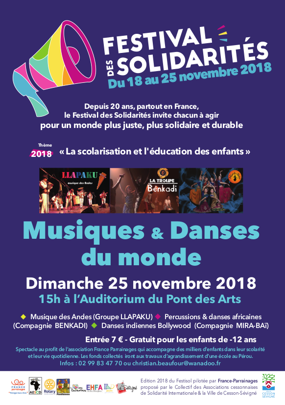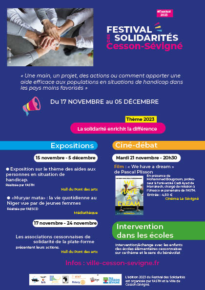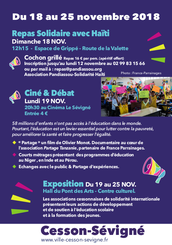 - du 19 au 25 novembre au Pont des Arts à Cesson-Sévigné, présentation des actions de développement et de soutien à l’éducation scolaire et à la formation des jeunes des associations cessonnaises de solidarité internationale