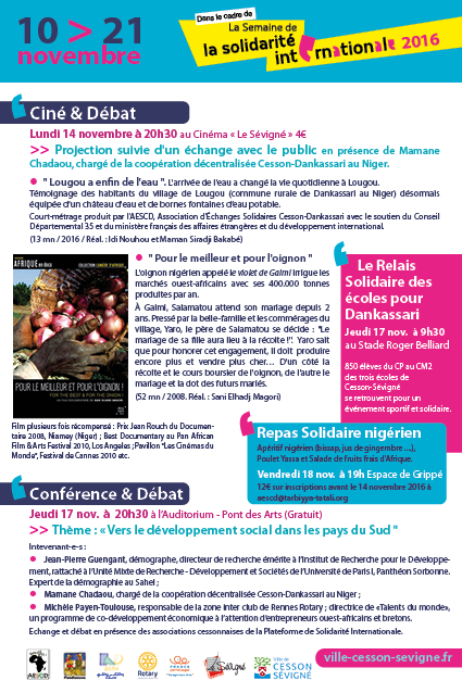 - le jeudi 20 novembre à 20 H 30 à l’auditorium du Centre Culturel de Cesson, la solidarité internationale au service du développement rural, avec notamment Bernard Jouan, président d’Agro Sans Frontières et responsable de projets en Afrique de l’Ouest,