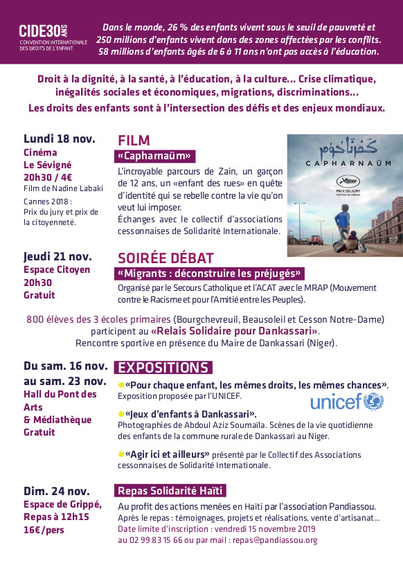 - du 16 novembre au 21 novembre expositions, "Pour chaque enfant, les mêmes droits, les mêmes chances" avec l’UNICEF, "Agir ici et ailleurs", avec les associations de solidarité internationale de Cesson-Sévigné, Hall d’entrée du Pont des Arts (Cesson-Sévigné),