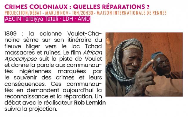 - Soirée « Crimes coloniaux, quelles réparations ? Le cas du Niger » le mardi 18 novembre de18 H à 20 H 30 à la Maison Internationale de Rennes. Projection du film « African Apocalypse » et débat en présence du réalisateur Rob Lemkin. Organisé par l’Association d’Echanges Culturels Ille et Vilaine Niger (AECIN) avec le soutien des Amis du Monde Diplomatique et de la Section Pays de Rennes de la Ligue des Droits de l’Homme.