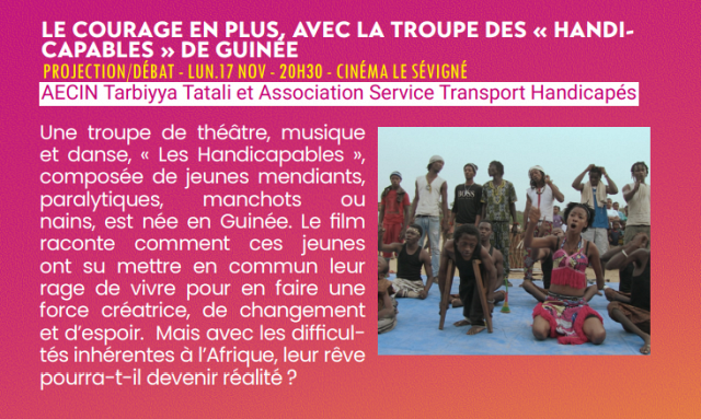 - Projection du film « Le courage en plus » de Billy Touré et Laurent Chevallier au Cinéma Le Sévigné le lundi 17 novembre à 20 H 30, suivie d’un débat avec Laurent Chevallier. Un partenariat entre l’Association d’Echanges Culturels Ille et Vilaine Niger (AECIN), l’Association Service Transport Handicapés (ASTH), le Cinéma Le Sévigné, le Réseau Français du Fauteuil Roulant et VraiVrai Films.